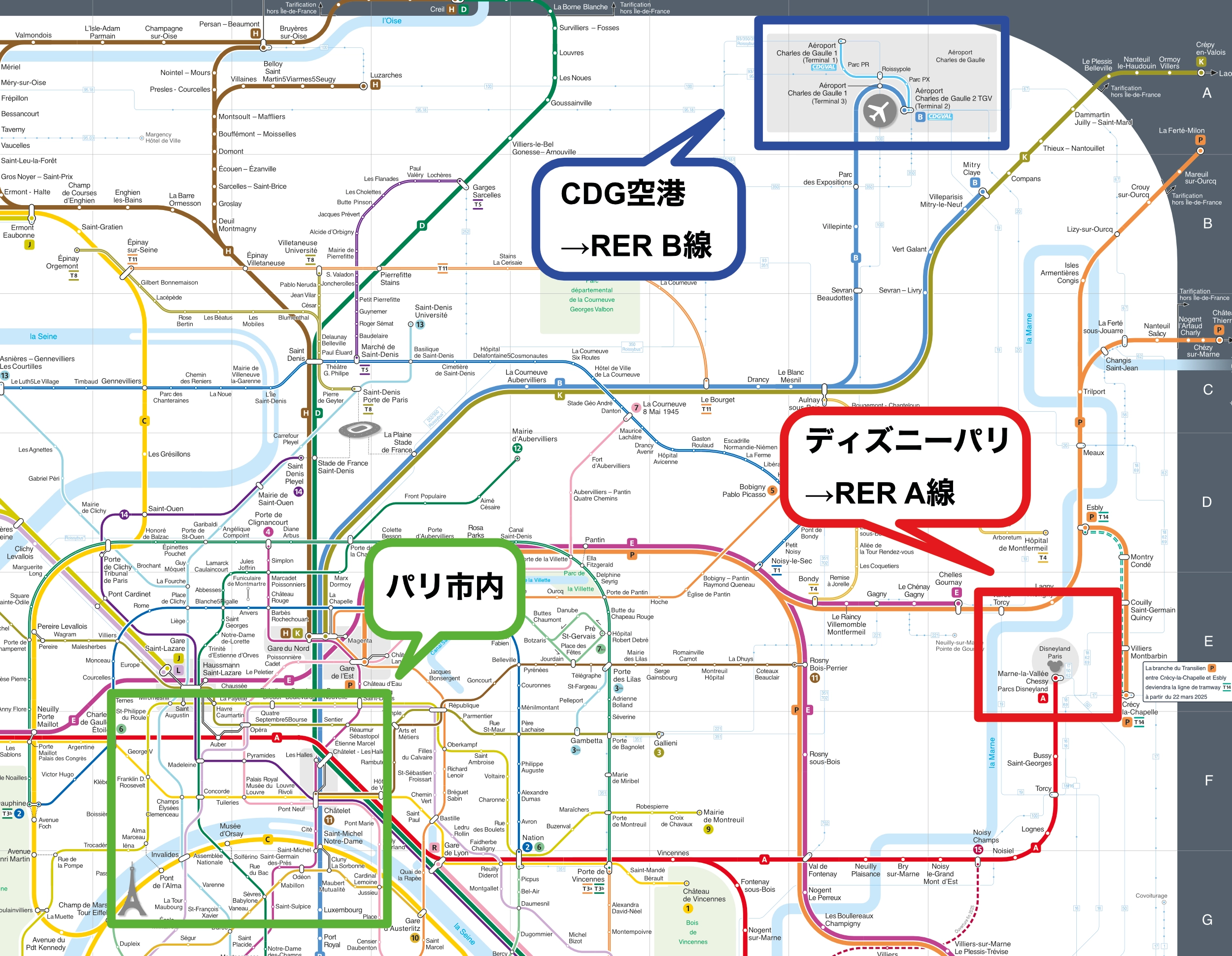 • 出発駅:Châtelet–Les Halles(シャトレ・レ・アル)/Auber(オペラ地区)/Nationなど